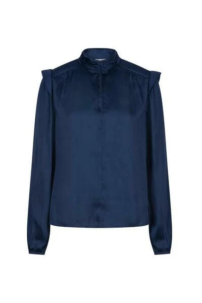 De Amari detail shoulder blouse van Dante 6 in de kleur blauw is een zeer chique blouse met schouder details. De blouse heeft een hoge hals met knoopsluiting en is gemaakt van Satijn. Prachtige blouse voor zakelijk gebruik of een avond uit.