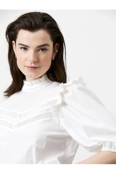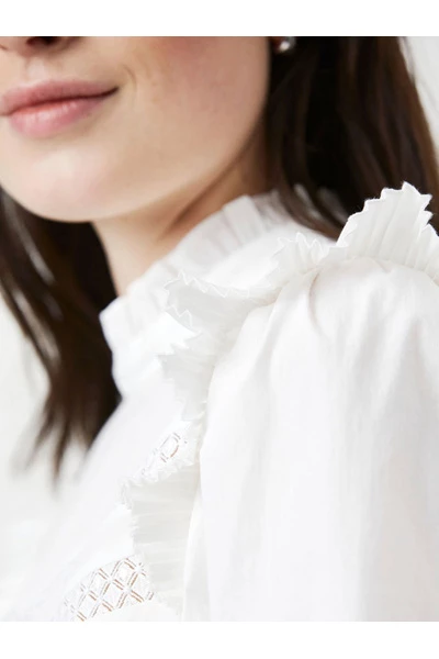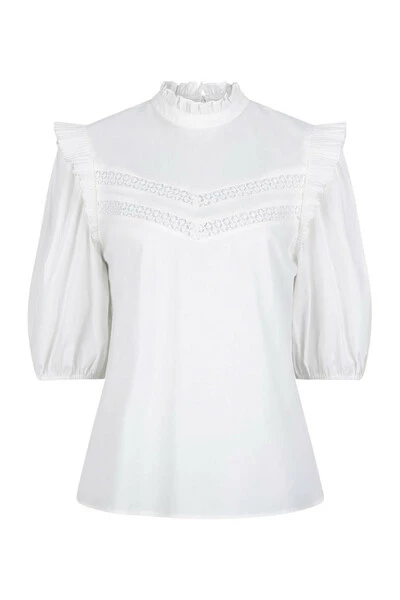 Dante 6 Suze top wit 223103 156 Product Omschrijving Deze Suze top van Dante 6 is nu bij ons verkrijgbaar. Verruil je klassieke top voor de elegante Suze top met kantdetails in wit. Gemaakt van een stretch popeline dat verantwoord katoen bevat, is het de perfecte duurzame keuze. De top heeft een hoge halslijn met ruches, een ontspannen silhouet met pofmouwen en schouderruches voor een krachtige look Product Samenstelling Materiaal: Katoenmix