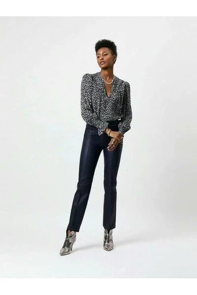 De top is gemaakt van viscose met metallic print en heeft een diepe V-hals. De lange mouwen zijn licht gepoft en hebben elastische boorden.