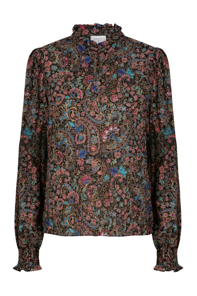 De bedrukte top met ruches heeft een opvallend ontwerp. Deze stijl heeft een hoge halslijn met een sleutelgat knoopsluiting aan de voorkant, de mouwen worden geaccentueerd met elastische plooien boven de elleboog om de look van een gepofte mouw te creëren.
