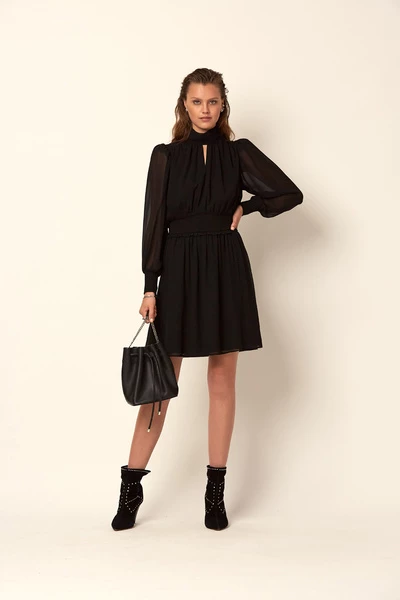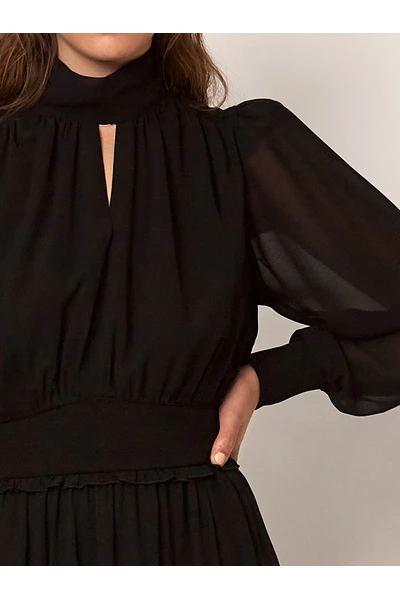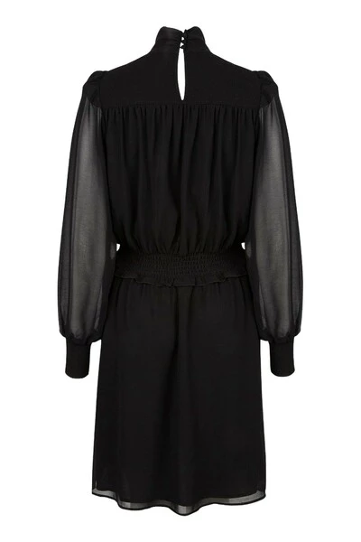 Dante 6 Lorna jurk zwart Product Omschrijving De Lorna jurk van Dante 6 is nu bij ons verkrijgbaar. De jurk is gemaakt van zachte crêpe met lichtgewicht mouwen van chiffon stof. De jurk heeft een hoogsluitende halslijn met een kleine rij knopen als sluiting op de rug. Langs de schouderlijn zitten plooitjes en de stof bij de schouders is gelaagd om een pofeffect te creëren. De mouwen van de jurk zijn licht transparant en de manchetten sluiten nauw aan en passen bij de crêpestof van het lijfje. De taille van de jurk wordt geaccentueerd met een extra laag stof en ruches Product Samenstelling Materiaal: Polyestermix