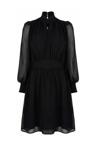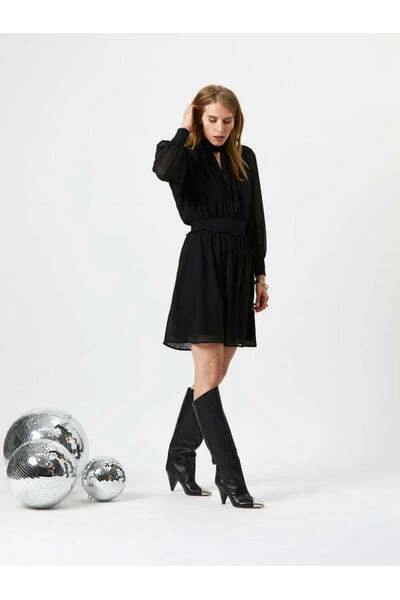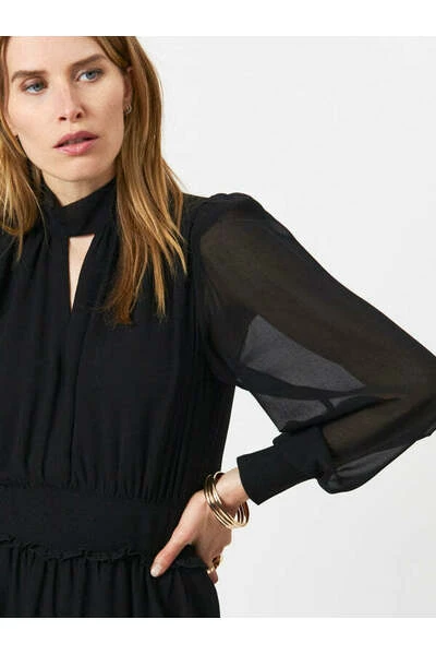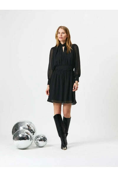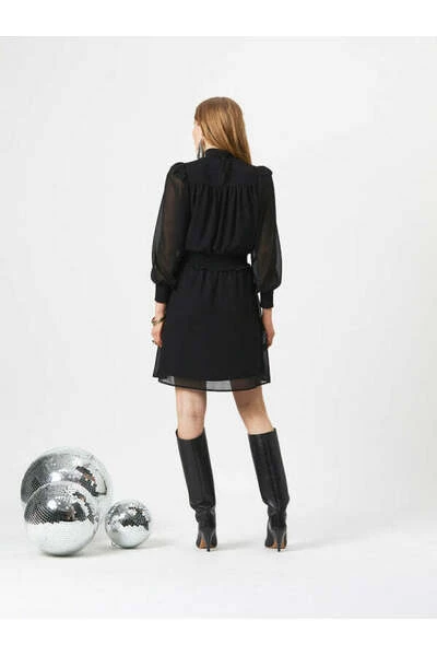 De Lorna -jurk in Raven is een elegante jurk voor elke gelegenheid. Gemaakt van een zachte crêpe met lichte chiffonvoer, heeft de jurk een hoog-klosjes halslijn met een kleine knoplijn om op de achterkant te sluiten. Er zijn rimpels langs de schouderlijn en de stof op de schouders is gelaagd om een puff effect te creëren. De mouwen van de jurk zijn enigszins transparant en de manchetten passen zich nauw aan en passen de crêpe van het lichaam. De taille van de jurk wordt benadrukt door een extra laag stof en ruches. Draag deze jurk met een eenvoudig paar zwarte laarzen en wees het hoogtepunt van de nacht. • Zachte crêpe • Lichte chiffon -mouwen • Sterk gesneden met knoppen aan de achterkant • Vouwen langs de schouders • Enigszins transparante mouwen • Accenteerde taille • Het model op de foto is 1,80 m lang en draagt onze maat