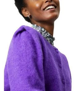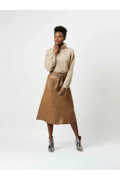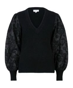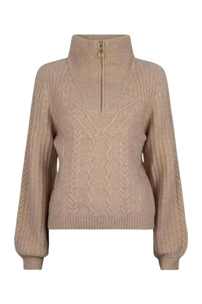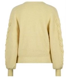 De trui is gemaakt van een zachte Yak wolmix en heeft een fijn gebreid patroon. De ballonmouwen hebben nauwsluitende manchetten. De halslijn van de trui heeft een gouden rits om een ​​V-vormige halslijn te creëren.