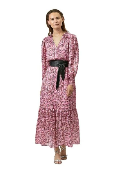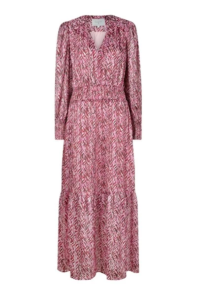 De Elisabel-jurk wordt geaccentueerd met een prachtige veelkleurige roze print. De maxi-jurk heeft een V-hals, een hoge split en sterke pofmouwen en wordt geleverd met een voeringjurk van Ecovero Viscose Viole. De tailleband is elastisch, waardoor de rok van de jurk natuurlijk en elegant valt. De pofmouwen eindigen in elastische manchetten. Draag de jurk met een paar leren laarzen en leg er een vest op voor koudere zomeravonden. • Maxi-jurk • Jacquardprint met metallic garen • V-hals • Elastische tailleband • Elastische manchetten • Hoge split • Het model op de foto is 1,78 lang en draagt ??onze maat 36