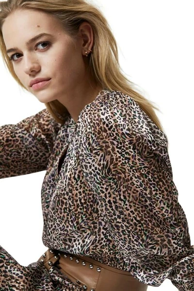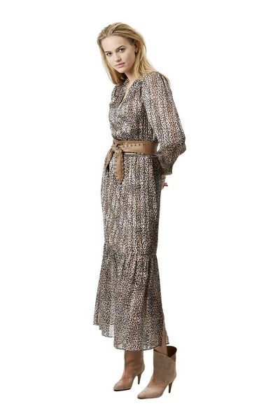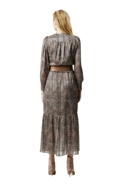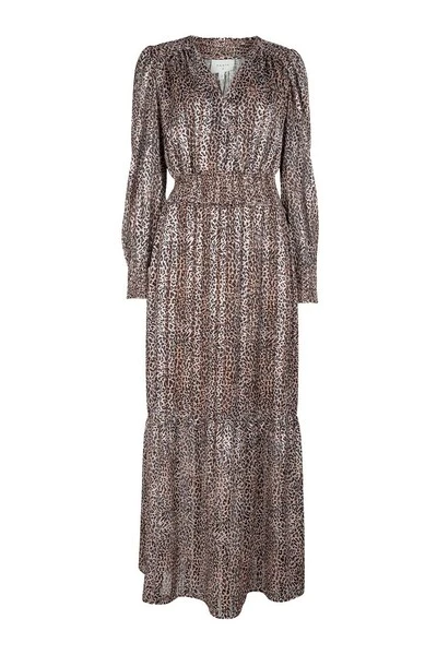 Elegante enkel lange jurk van Dante 6 in prachtige dierenprint met metalen. De jurk heeft een diepe V-cut en lange mouwen met kleine pube op schouder- en kuildetail aan de pols. Er is elastiek in de taille en een hoge spleet van de linkerknie.